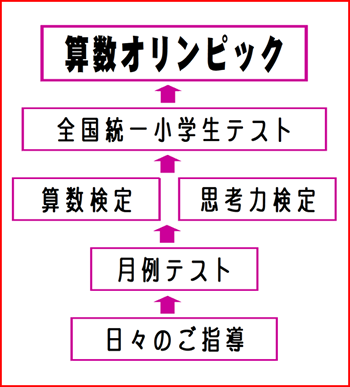 日々のご指導は月例テスト・思考力検定・算数検定・全国統一小学生テストと連動し、飛び級制との融合により、お子さまの可能性へ挑戦します。